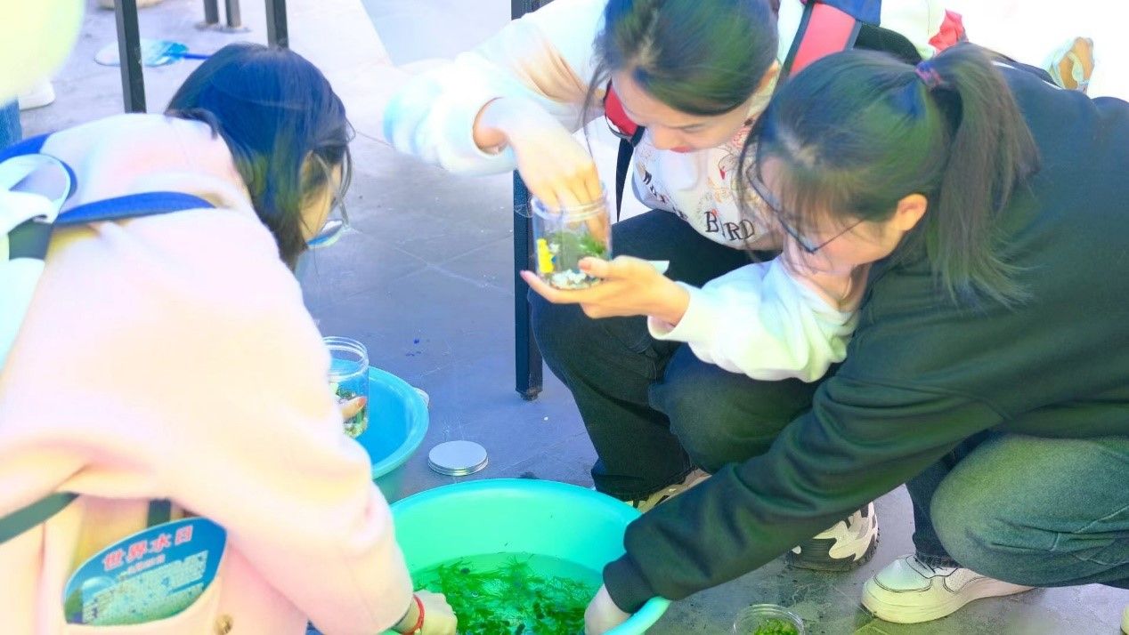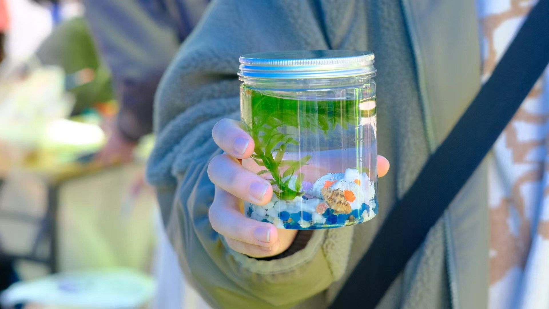 活动中,志愿者帮助参与者亲自动手打造模拟水环境的生态瓶,同时向参与者讲述养护生态瓶的方法,最后为其科普地球生态系统的相关知识。